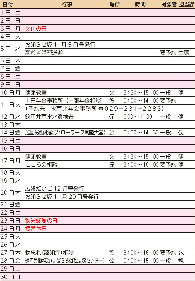 くらし CALENDER 2025年11月 19/22 前の記事 次の記事 発行日 : 2025年10月20日 自治体名 : 茨城県大子町 広報紙名 : 広報だいご 令和7年11月号 ■CALENDER ■連絡先 ■救急協力当番病院 慈泉堂病院【電話】72-1550 久保田病院【電話】72-0023 保内郷メディカルクリニック【電話】72-0179 Tweet シェアする FMだいご番組表 2025年10月~ 11月の納付・広域無料法律相談、健康相談、延長窓口