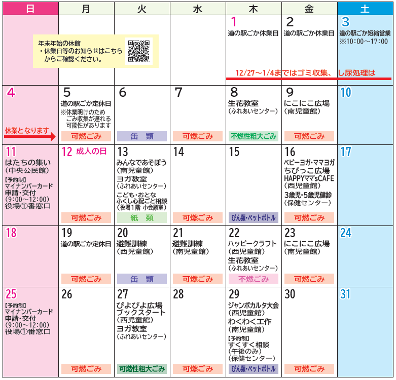 くらし 1月お知らせカレンダー 24/26 前の記事 次の記事 発行日 : 2026年01月01日 自治体名 : 茨城県五霞町 広報紙名 : 広報ごか 2026年1月号 ◆1月の納税 納期限:2/2(月) ・国民健康保険税 7期 会計・収納係【電話】84-1966 ・後期高齢者医療保険料 7期 会計・収納係【電話】84-1966 Tweet シェアする 本を読もう!図書室へ行こう! 人口と世帯 12月1日現在
