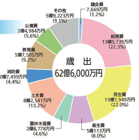 歳出として主なものは、総務費・民生費となり、歳出全体の44.3%となっています。総務費については、複合庁舎建設に向けた設計費やふるさと応援寄附金にかかる経費、民生費については児童手当や障害福祉サービスにかかる扶助費が多くなっています。