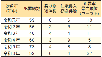 令和6年中における五霞町の刑法犯認知件数は52件で、五霞町役場や防犯ボランティア団体、地元企業による官民一体となった犯罪抑止活動の成果が功をなし、令和5年中と比較して21件認知件数を減少させることができました。