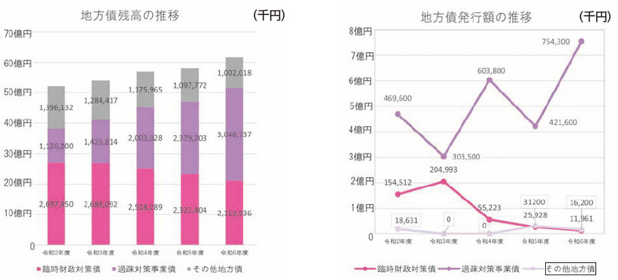 令和6年度における地方債発行の主な内容は、全額が交付税措置される臨時財政対策債が1196万1千円、7割が交付税措置される過疎対策事業債が7億5430万円となっています。