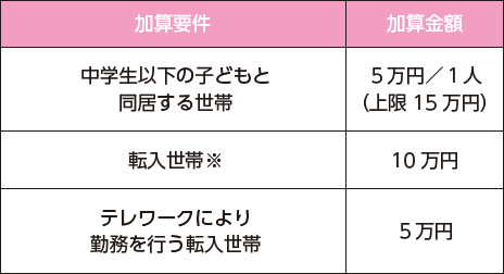 ※下記加算要件に該当する場合、それぞれ助成金に加算します。(助成金の交付は、同一申請者(同居人も含む)に対して1回限りとします。)