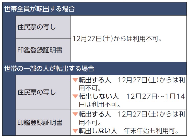 ただし、転出予定日が12月27日~1月4日の転出届を提出した人やその同一世帯の人は、コンビニ交付サービスを利用できない期間(右の表参照)がありますので、ご注意ください。