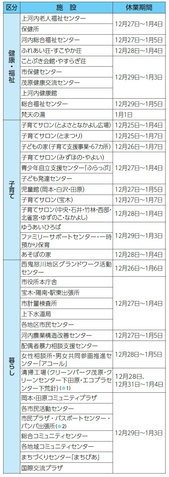 また、各施設の休業期間は施設によって異なります。大変ご迷惑をお掛けしますが、ご協力をお願いします。