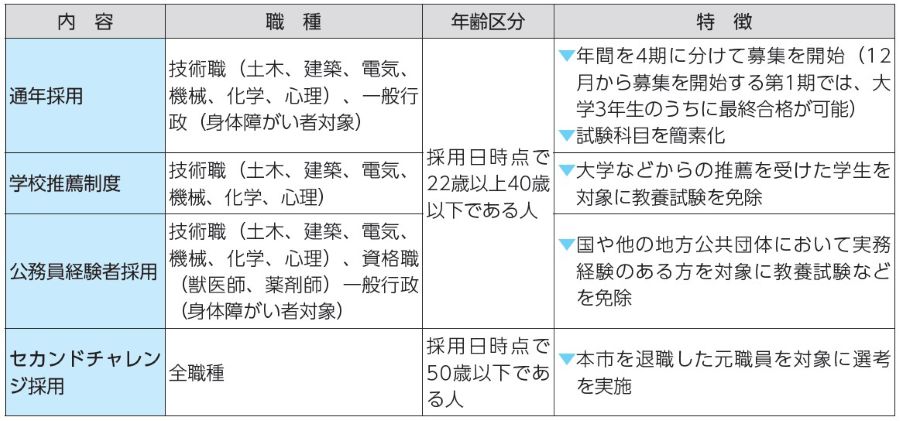 一部の職種において、令和9年4月に向けた職員募集を12月から開始するほか、下の表の通り、試験内容の見直しを行います。詳しくは、市などで公表する採用試験案内をご確認ください。