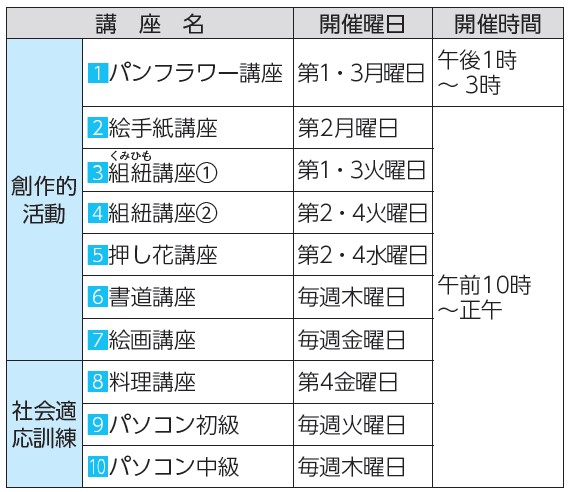 その他:創作的活動・社会適応訓練から2講座、運動から2講座が希望できます。ただし、同曜日同時間、同名の講座の重複申し込みは不可。なお、初めて申し込む人を優先します。