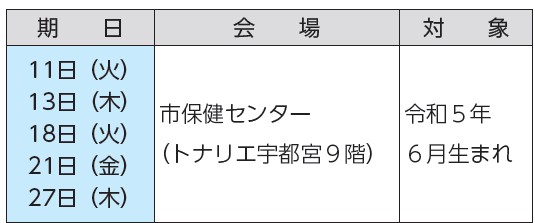 持ち物:母子健康手帳、バスタオルなど。