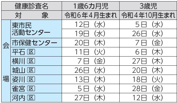 各健康診査とも対象の子どもにお知らせを送付します。対象の月末になってもお知らせが届かない場合は、ご連絡ください。