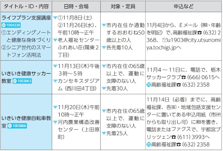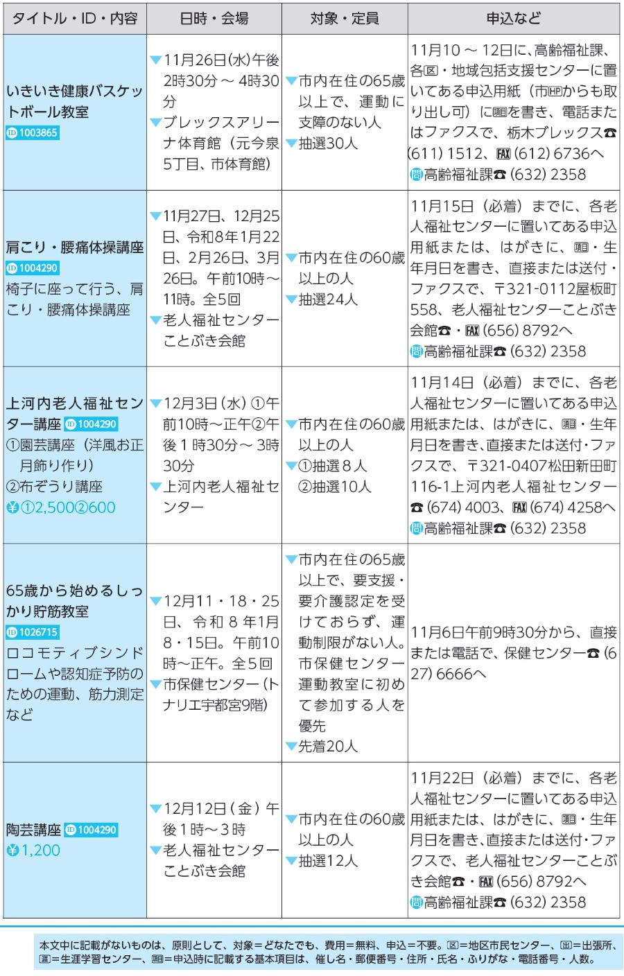 講座 シニア対象の教室・講座・催し 17/62 前の記事 次の記事 記事を読み上げる 発行日 : 2025年11月01日 自治体名 : 栃木県宇都宮市 広報紙名 : 広報うつのみや 2025年11月号 No.1796 Tweet シェアする [シニア]お知らせ 要介護高齢者を介護する家族など対象「ひとりで悩まず一緒に学ぼう 家族介護教室」