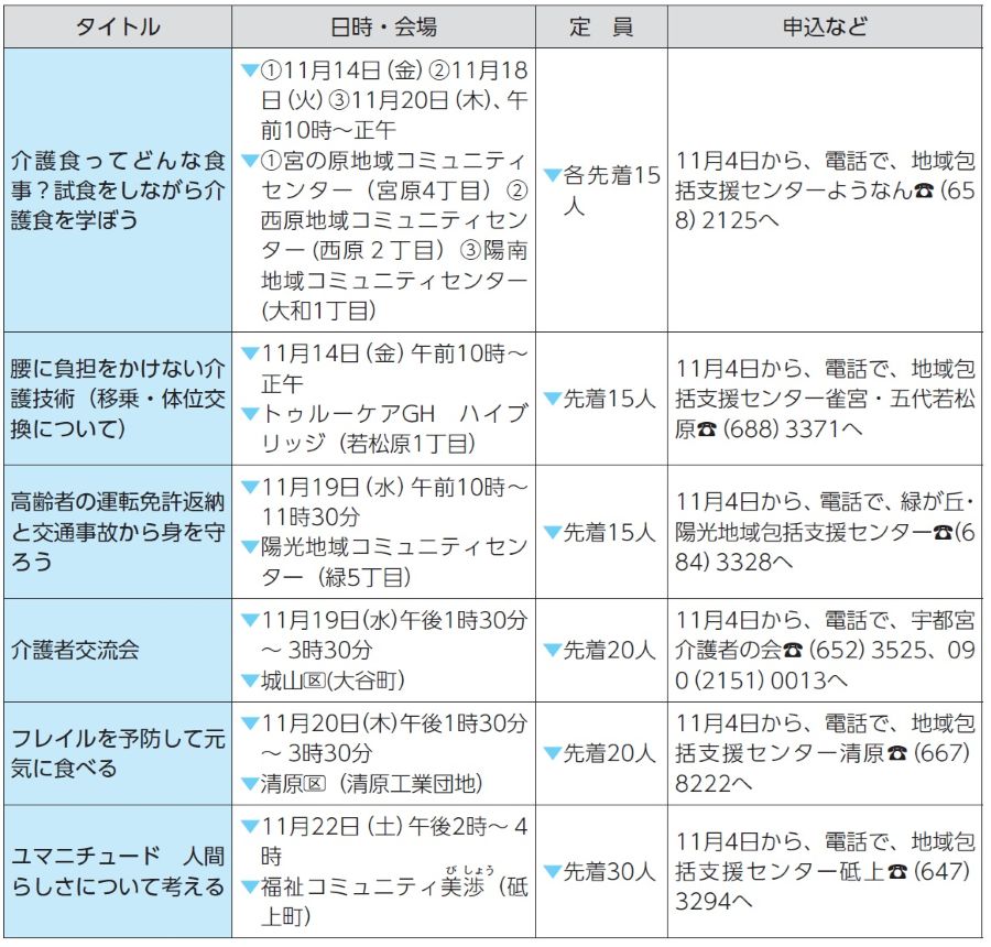 講座 要介護高齢者を介護する家族など対象「ひとりで悩まず一緒に学ぼう 家族介護教室」 18/62 前の記事 次の記事 記事を読み上げる 発行日 : 2025年11月01日 自治体名 : 栃木県宇都宮市 広報紙名 : 広報うつのみや 2025年11月号 No.1796 ID:1003862 問合せ:高齢福祉課 【電話】632-2357 Tweet シェアする シニア対象の教室・講座・催し [健康・福祉・国保・年金]お知らせ