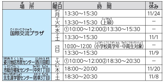 問合せ:多文化共生推進課(たぶんかきょうせいすいしんか)(旭(あさひ)1丁目(ちょうめ)1-5市役所(しやくしょ)10階(かい))