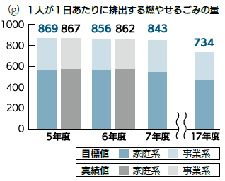 1人が1日あたりに排出する燃やせるごみの量について、市民の皆さんの協力により、5年度から6年度かけては減りましたが、計画目標値には届きませんでした。7年度は達成できるよう、引き続きご協力をお願いします。