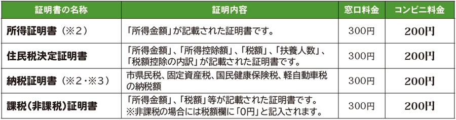 ※2 「児童手当用所得証明書」、「車検用納税証明書」の取得はできません。窓口での発行となります。