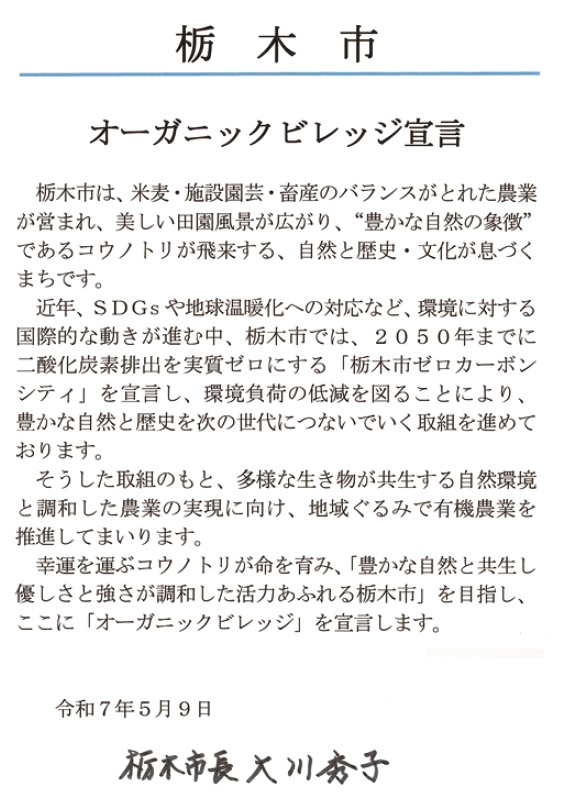 栃木市では、令和7年3月に有機農業実施計画を策定、5月に「オーガニックビレッジ宣言」を行い、環境にやさしい農業によるまちづくりを進めています。