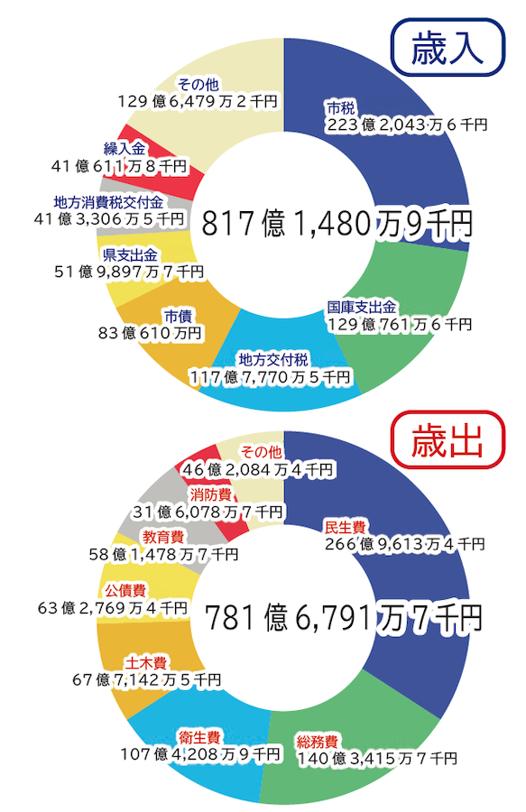 令和6年度の一般会計の決算は、歳入(収入)が817億1,480万9千円、歳出(支出)が781億6,791万7千円でした。差し引きは35億4,689万2千円でしたが、令和7年度で引き続き実施する事業に使う財源が1億3,518万7千円含まれているため、実質的な収支は34億1,170万5千円の黒字となりました。