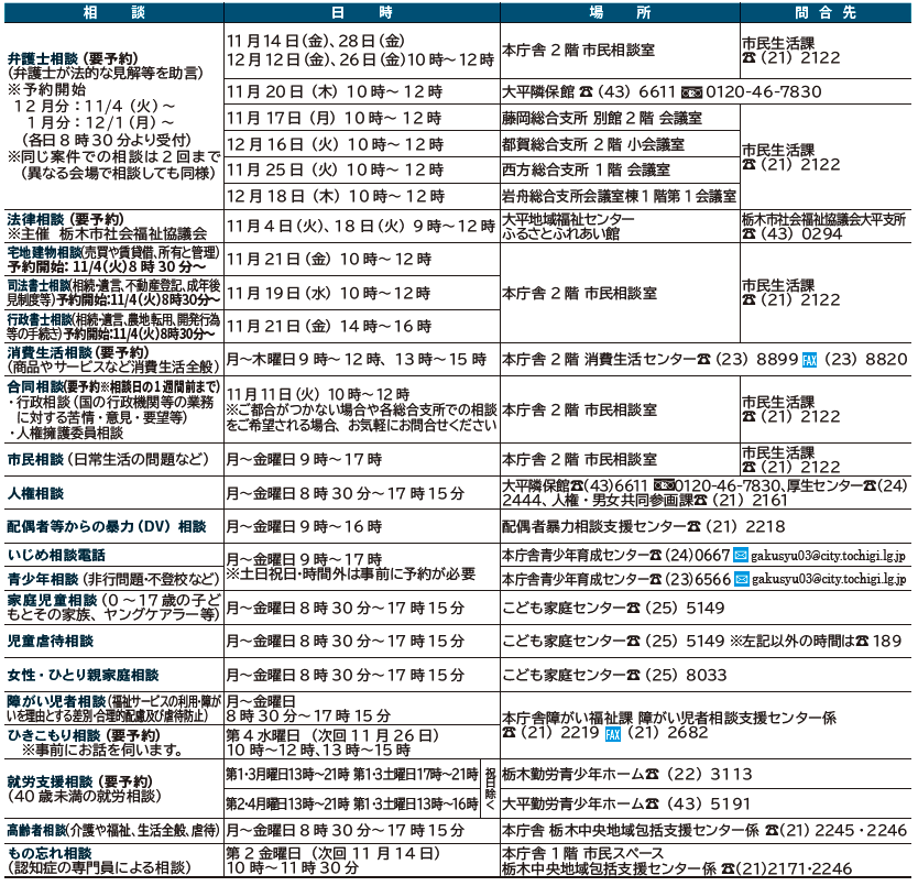 くらし 相談業務の案内 18/44 前の記事 次の記事 発行日 : 2025年10月20日 自治体名 : 栃木県栃木市 広報紙名 : 広報とちぎ No.187 令和7年11月号 相談は無料で秘密は厳守します。気軽にどうぞ。市内の方であれば、どの窓口でも相談できます。 Tweet シェアする くらしの窓 インフォメーション-お知らせ(1)