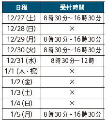 通常どおり:12月27日(土)・29日(月)・30日(火)・31日(水)・1月5日(月)