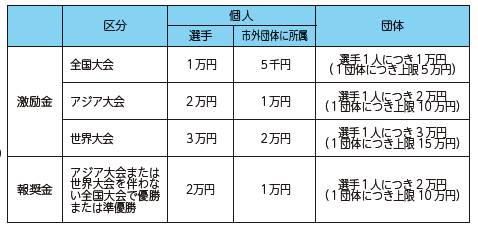 報奨金…アジア大会または世界大会を伴わない全国大会で優勝または準優勝した団体・選手
