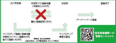 マイクロチップ装着犬をデータベースに登録するため、マイクロチップを装着後は、環境省の指定登録機関に登録が必要です(オンライン登録で400円、紙での登録で1,400円の手数料がかかります)。
