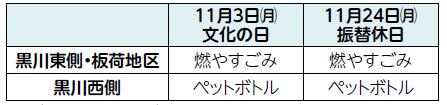 11月3日(月・文化の日)・11月24日(月・振替休日)は通常どおりごみ収集を行います。午前8時30分までにごみステーションに出してください。なお、し尿収集、環境クリーンセンターへのごみの持ち込みは休みです。