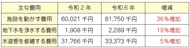 物価高騰により工事費用や維持管理費用が増加しています。4年間で経費総額が6,700万円増加しています。