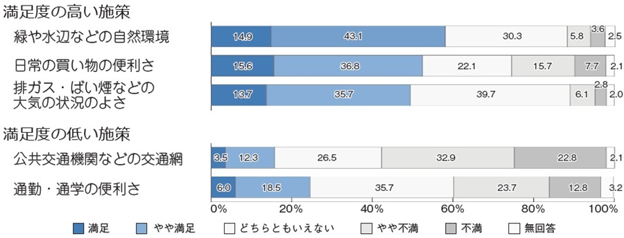一方、「不満」「やや不満」を合わせた割合が最も高い項目は「公共交通機関などの交通網」「通勤・通学の便利さ」と交通に関する点に不満が多いことがわかりました。