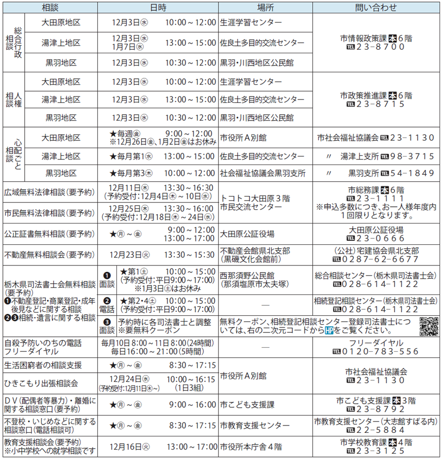 くらし 各種相談 40/48 前の記事 次の記事 発行日 : 2025年12月01日 自治体名 : 栃木県大田原市 広報紙名 : 広報おおたわら 令和7年12月号(No.1341) ★…祝日・年末年始を除く。 ※大田原市の市外局番は「0287」です。携帯電話からかける際はご注意ください。 Tweet シェアする 休日当番医 子育て支援情報