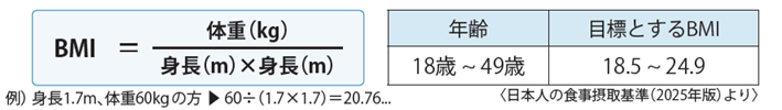 身近な健康状態のチェック指標として体重(体格)がありますが、適正な体重を知る指標のひとつにBMI(Body Mass Index[体格指数])があります。体重と身長から計算することができます。