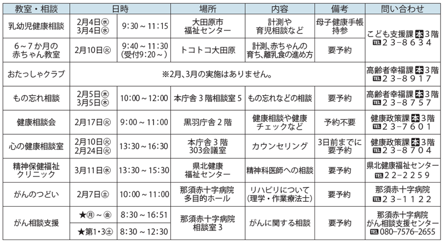健康 保健に関する教室・相談 37/43 前の記事 次の記事 発行日 : 2026年02月01日 自治体名 : 栃木県大田原市 広報紙名 : 広報おおたわら 令和8年2月号(No.1343) ★…祝日・年末年始を除く。 Tweet シェアする 子育て支援情報 市民健康診査