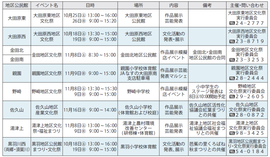 イベント 日程一覧 各地区公民館まつり・文化祭開催のお知らせ 14/49 前の記事 次の記事 発行日 : 2025年10月01日 自治体名 : 栃木県大田原市 広報紙名 : 広報おおたわら 令和7年10月号(No.1339) 問合せ:生涯学習課[本]4階 【電話】0287‒23‒2005 Tweet シェアする 夢・未来そして郷土愛25 第37回与一の里大田原市産業文化祭 お知らせー子育て