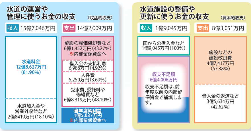 収益的収支は黒字で健全な経営が出来ていますが、今後の水道施設の整備や更新を考えると、将来に向けた備えが十分とは言えません。