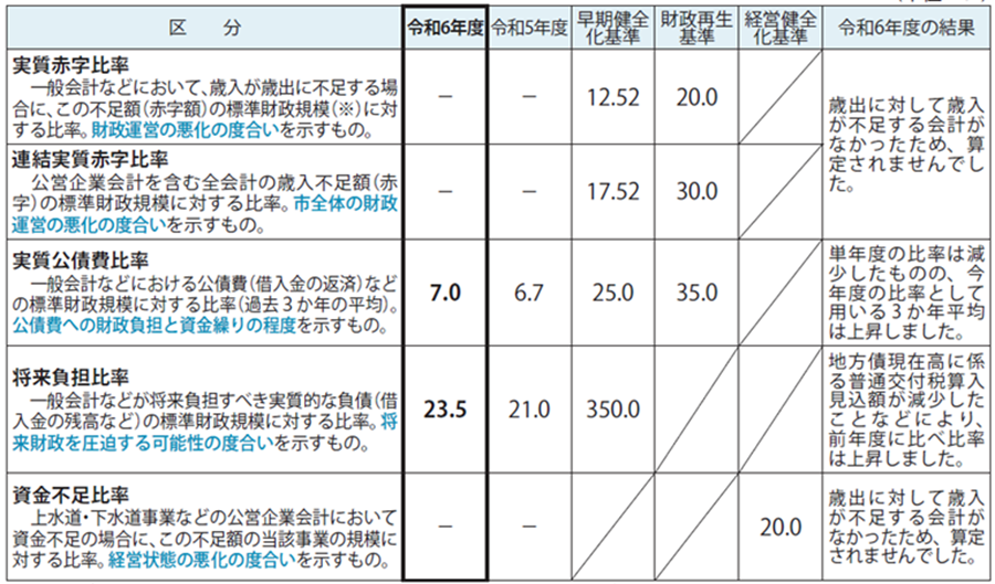 ■令和6年度決算に基づく健全化判断比率と資金不足比率(単位:%)