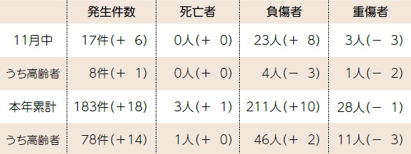 くらし 11月の交通事故発生状況(人身事故) 16/27 前の記事 次の記事 発行日 : 2026年01月20日 自治体名 : 栃木県那須塩原市 広報紙名 : 広報なすしおばら 令和8年1月20日号(ナンバー442) ( )は前年同月比 問い合わせ:[本]交通防犯課 【電話】62-7127 Tweet シェアする 11月の火災と救急 マイナンバーカード【休日】交付・申請・更新マイナ保険証利用申し込み支援