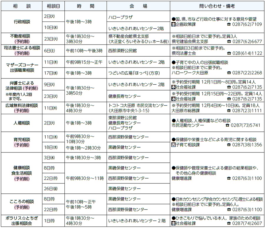 くらし 一人で悩まず困ったら相談を 12月の各種無料相談カレンダー 25/29 前の記事 次の記事 発行日 : 2025年11月20日 自治体名 : 栃木県那須塩原市 広報紙名 : 広報なすしおばら 令和7年11月20日号(ナンバー440) Tweet シェアする 大田原市 大関 和 Oozeki Chika 12月の休日当番医