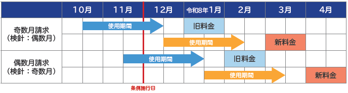 奇数月請求の方は令和8年2月検針・3月請求分から、偶数月請求の方は令和8年3月検針・4月請求分から料金が変わります。