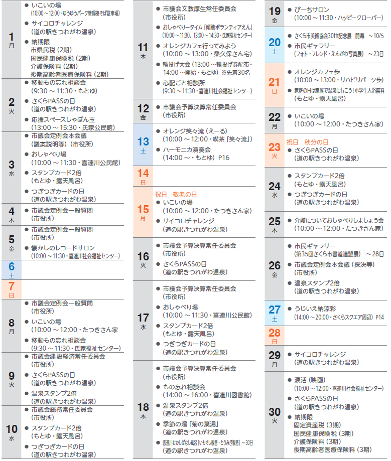 くらし 広報カレンダー9月 39/41 前の記事 次の記事 発行日 : 2025年09月01日 自治体名 : 栃木県さくら市 広報紙名 : 広報さくら 令和7年9月1日号 ※全市民に関わる内容、どなたでも予約なしで参加いただけるイベントです。 Tweet シェアする 市長コラム 窓口延長/施設休館日/市営温泉休業日