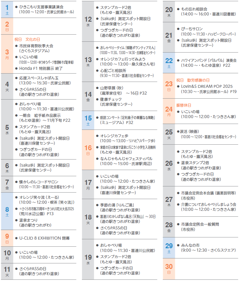 くらし 広報カレンダー11月 44/46 前の記事 次の記事 発行日 : 2025年11月01日 自治体名 : 栃木県さくら市 広報紙名 : 広報さくら 令和7年11月1日号 ※全市民に関わる内容、どなたでも予約なしで参加いただけるイベントです。 Tweet シェアする 市長コラム 窓口延長/施設休館日/市営温泉休業日