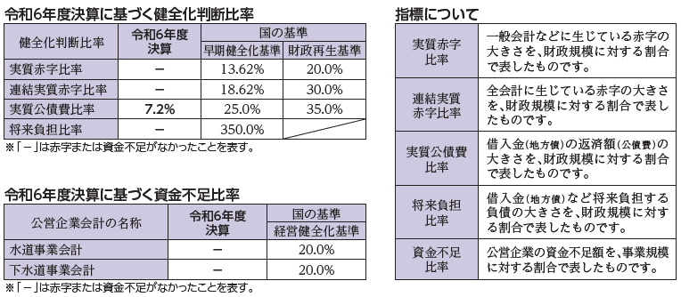 令和6年度決算に基づく算定の結果は、表のとおりです。いずれの比率も国の基準値以下であり、健全団体に該当しました。