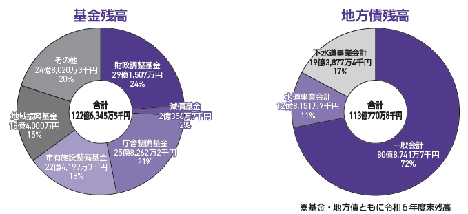 令和6年度は、13億3,655万2千円を積み立てて、市有施設の整備や森林環境整備のために6億2,250万円を取り崩したよ。その結果、令和6年度末現在の全基金の残高は、122億6,345万5千円となったよ。