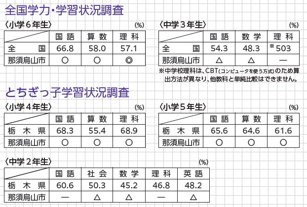 本市の小・中学校が全国および県の学力・学習状況調査を実施しました。これらの調査は、子どもたちの学力の一側面を把握するとともに、学習への取り組みや生活習慣について確認するために実施されたものです。