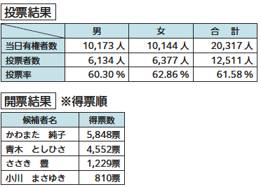 本選挙には4人が立候補し、8年ぶりに投票が行われました(令和3年は無投票)。投開票の結果、現職の川俣純子氏(65)が当選し、3期目の就任となります。