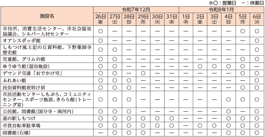年末年始の市役所等の業務は、下表のとおりお休みとなります。ご不便をおかけしますが、ご理解のほどよろしくお願いします。