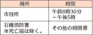 閉庁期間でも、死亡届、出生届、婚姻届などの戸籍届書は、下表の施設で受け付けます。届出の内容によっては、平日に再度ご来庁いただく場合があります。