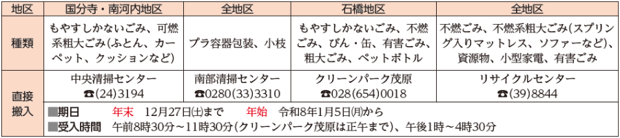 年末年始はごみの量の増加により収集が遅くなることがありますが、行政カレンダーをご確認のうえ、早めにごみステーションに出すよう、ご協力をお願いします。各清掃センターへの直接搬入は以下のとおり可能ですが、混雑状況により長時間お待ちいただくことがありますので、ご了承ください。