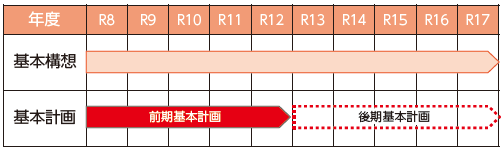 令和8~17年度までの10年間を計画期間とする「基本構想」と、令和8年度からの5年間を期間とする「前期基本計画」、さらに令和13年度からの5年間を期間とする「後期基本計画」で構成されます。