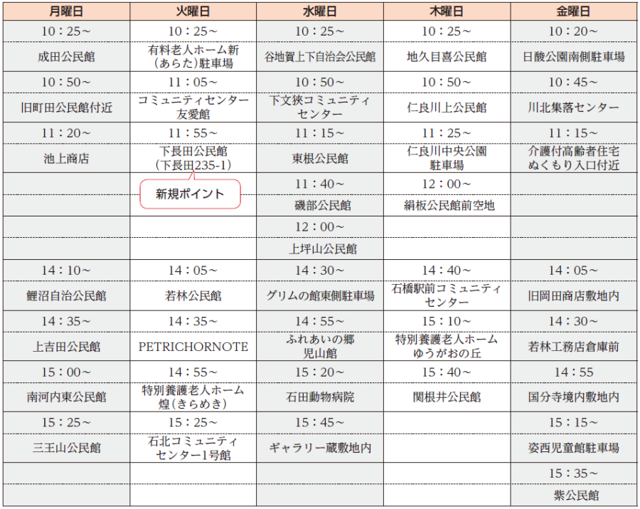 令和8年2月2日(月)から、市内の移動販売(移動スーパー)の場所や時間が変更になります(広報11月号で1月からの変更とお知らせしましたが、2月からとなりました)。毎週月曜日から金曜日まで、祝日も含めて運行します。どなたでもご利用いただけますので、近くにお住まいの方は、ぜひご活用ください。商品のご要望については、販売スタッフが直接お受けいたします。