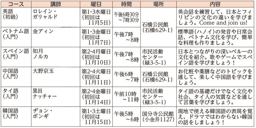 各言語を母語とする講師が初歩の文法や簡単な会話を教えます。文化に関するトークもお楽しみに!