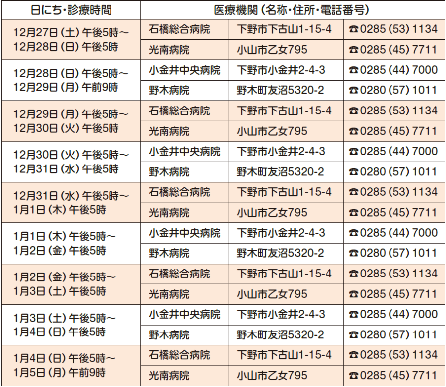 ■年末年始の在宅当番医(小山地区医師会管内)