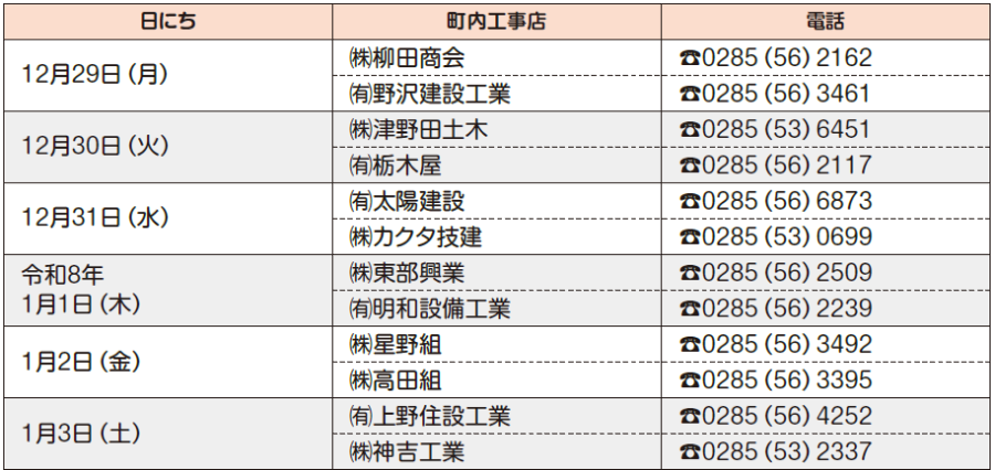 年末年始の水のトラブルについては、町内工事店の当番制となりますので、下記にお問い合わせください。