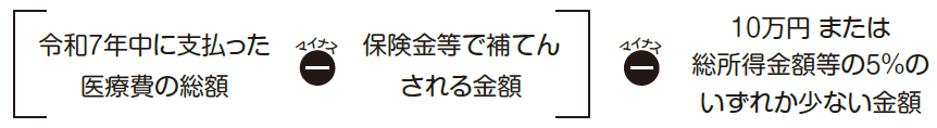 申告する方やその方と生計を一にする配偶者やその他の親族のために、令和7年中に支払った医療費がある場合は、次のとおり計算した金額(最高200万円)を医療費控除として所得金額から差し引くことができます。